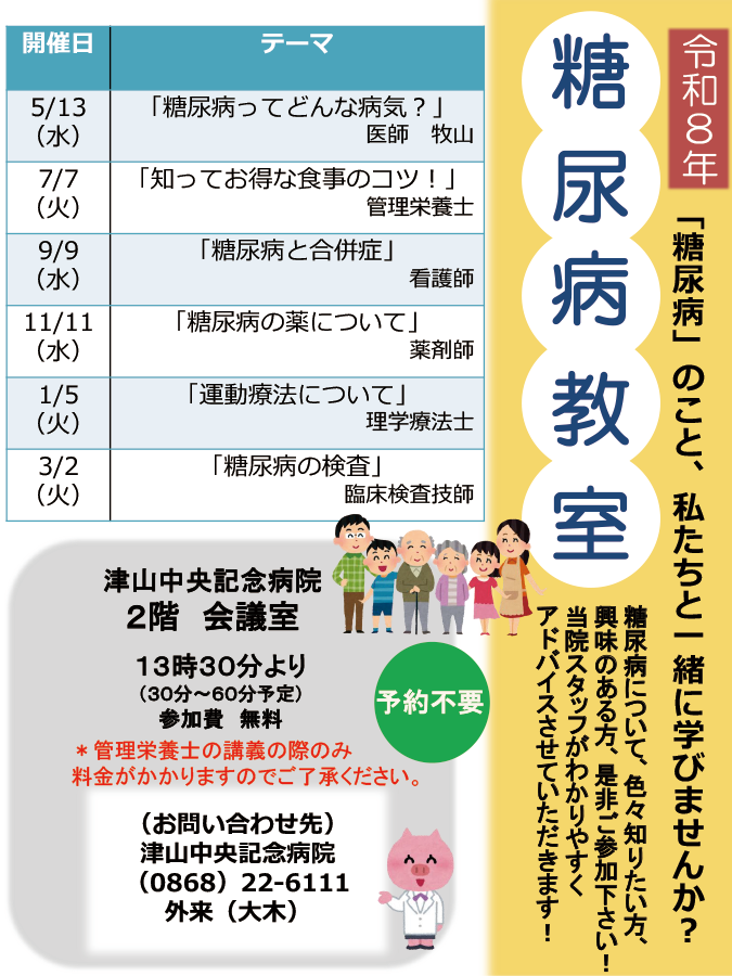 当院では、糖尿病の患者さんとご家族の方に向けた糖尿病教室を開催しております。医師、看護師、薬剤師、臨床検査技師、管理栄養士、理学療法士などが講師を努めます。火曜・水曜日に開催しておりますのでお気軽にご参加下さい。
